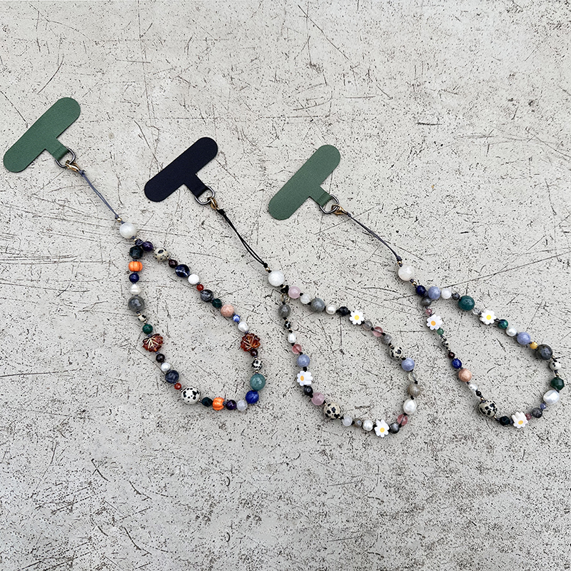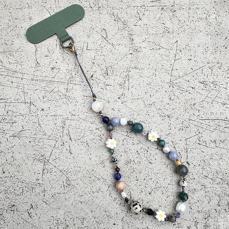Unikalny, ręcznie wykonany breloczek z naturalnych kamieni z motywem elementów kwiatków, który doda Twojemu telefonowi wyjątkowego charakteru. Dodatkowo dodatkowe zapięcie do przyczepienia breloczka do torby.