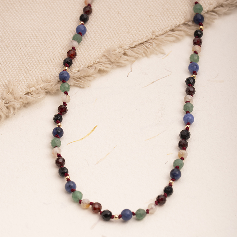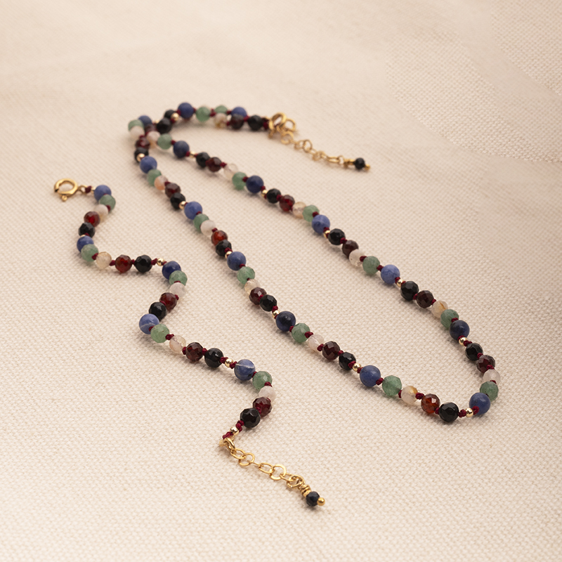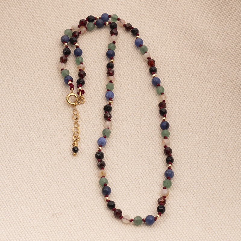 Ręcznie zrobiony Naszyjnik metodą supełkową - Essence Energy z naturalnych kamieni: sodalitu, granatu, cytrynu, zielonego awenturynu, czarnego onyksu i przy zapięciu czarnego turmalinu.