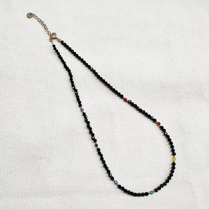 Naszyjnik z czarnych turmalinów z kolorowymi kamieniami: czerwonym koralem, pomarańczowym karneolem, żółtym agatem, zielonym agatem, topazem London Blue oraz ametystem.