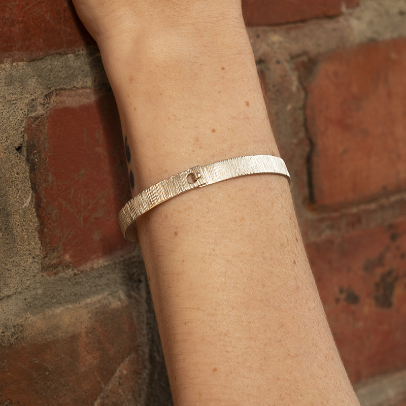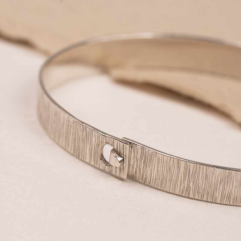 Elegancka bransoletka BANGLE typu obręcz, recznie wykonana ze srebra próby 925. Bransoletka zapinana fakturowana w delikatne paski, które subtelnie odbijają światło i dodają całości nowoczesnego, ale szlachetnego charakteru.