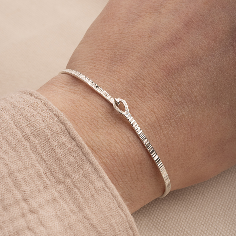 Elegancka bransoletka BANGLE typu obręcz, recznie wykonana ze srebra próby 925. Bransoletka zapinana fakturowana w delikatne paski, które subtelnie odbijają światło i dodają całości nowoczesnego, ale szlachetnego charakteru.