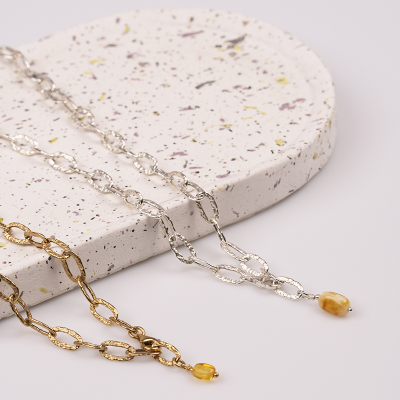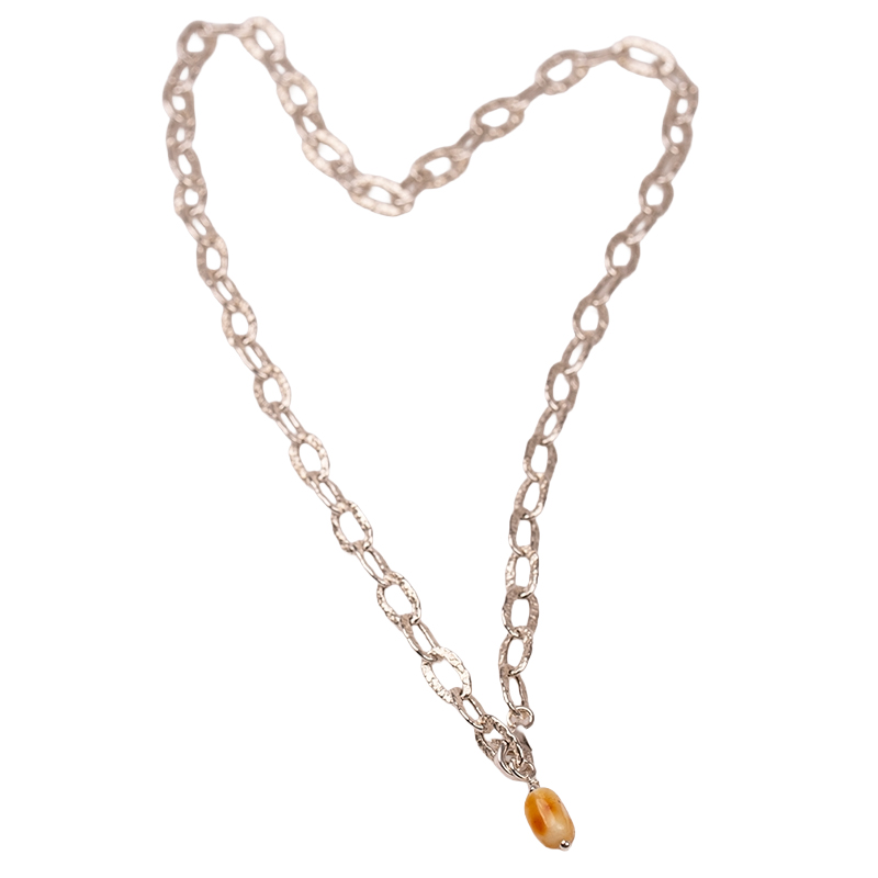 Jego ozdobą jest naturalny bursztyn umieszczony przy zapięciu – każdy kamień ma unikalny kształt i barwę.