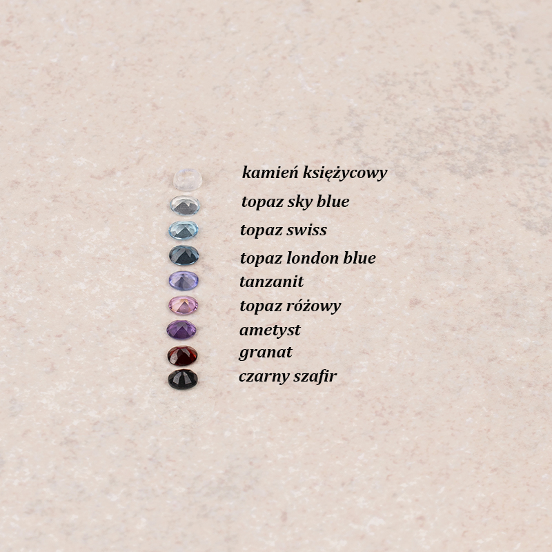 W naszej kolekcji znajdziesz kamienie takie jak: oliwin, cytryn, ametyst, topaz London Blue / Swiss lub biały, granat, kwarc z turmalinem, kwarc dymny / czarny szafir – każdy z nich w szlifie fasetowanym, co zapewnia im niesamowity blask i głębię.