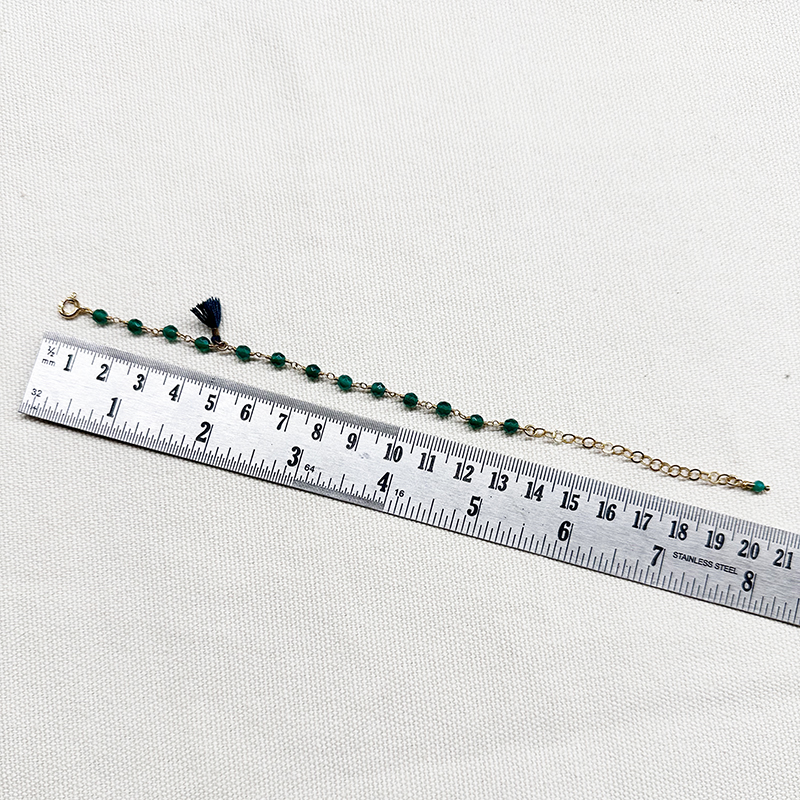 Bransoletka na łańcuszku z zielonymi chwostami (kolor zielonej butelki) wykonana ze srebra pr.925 złoconego z regulacją.