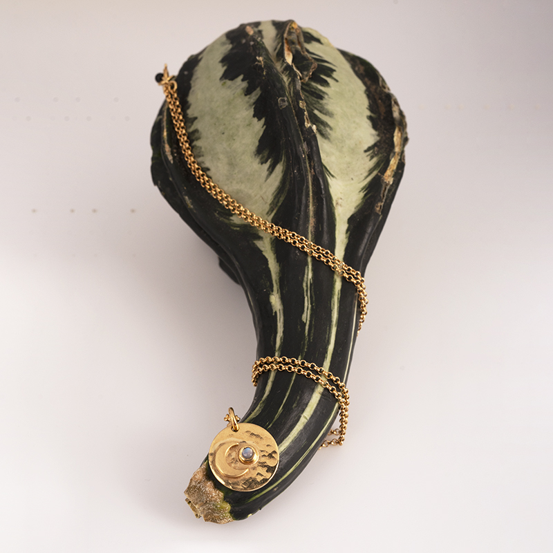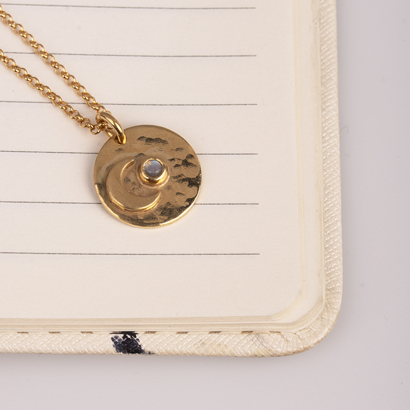 Zanurz się w blasku naszyjnika MOONA. To połączenie siły natury i delikatności światła nocnego nieba. Młotkowana blaszka o nieregularnej fakturze odbija światło niczym powierzchnia księżyca, a subtelny kamień księżycowy lśni chłodnym, nieuchwytnym niebieskim połyskiem — jak kropla światła ukryta w złocie. Symbol półksiężyca przypomina o cykliczności i kobiecej energii, o tym, że w każdej fazie możemy świecić swoim własnym światłem.