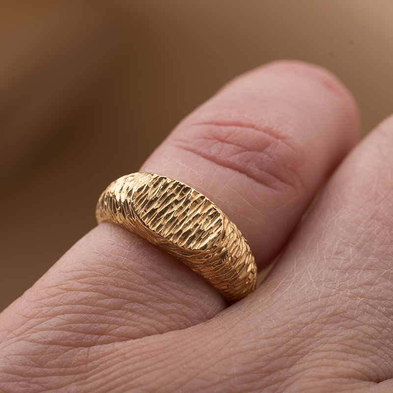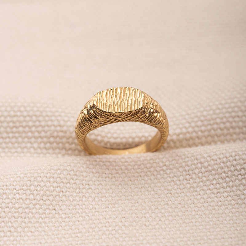 Sygnet RISK to połączenie wyrazistej formy i rzemieślniczej precyzji. Każdy egzemplarz powstaje ręcznie ze srebra próby 925, a następnie jest złocony warstwą 2 mikronów, dzięki czemu zyskuje elegancki, szlachetny odcień i trwałość na co dzień.