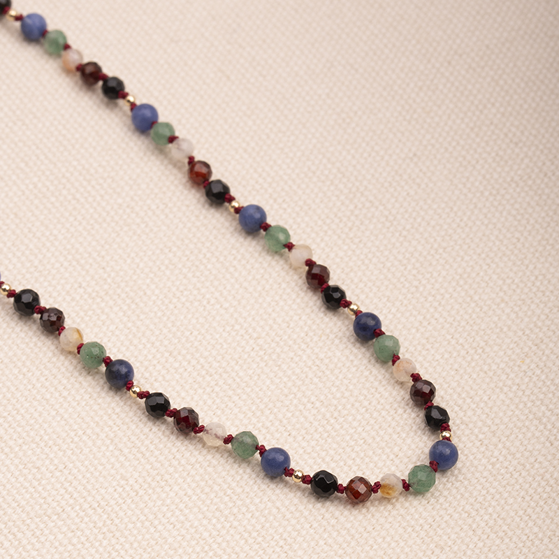 Ręcznie zrobiony Naszyjnik metodą supełkową - Essence Energy z naturalnych kamieni: sodalitu, granatu, cytrynu, zielonego awenturynu, czarnego onyksu i przy zapięciu czarnego turmalinu.