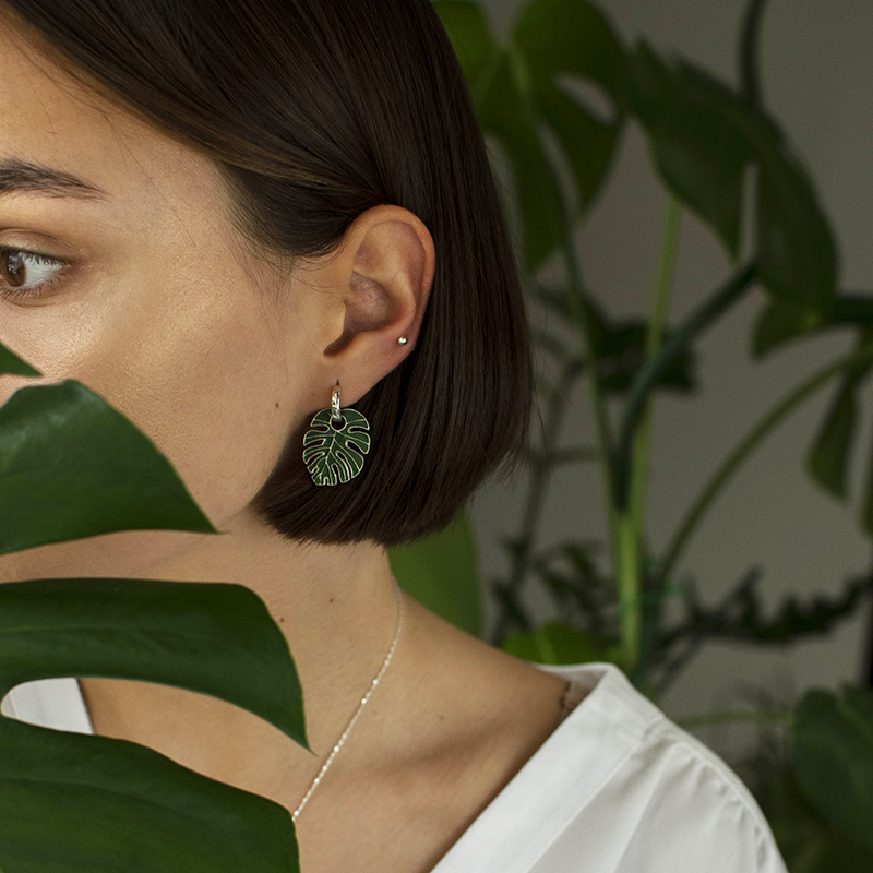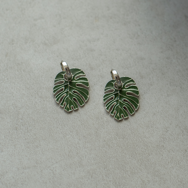 Piękne modułowe kolczyki Monstera - kółeczko (baza) + zawieszka, wykonane ze srebrapr.925.