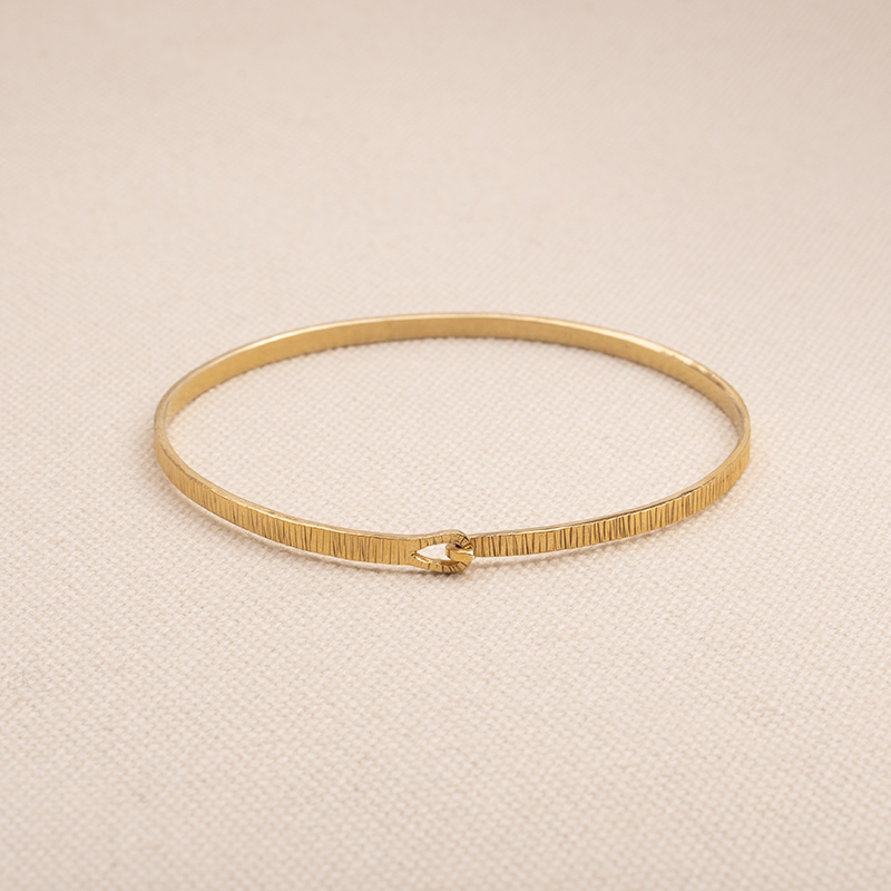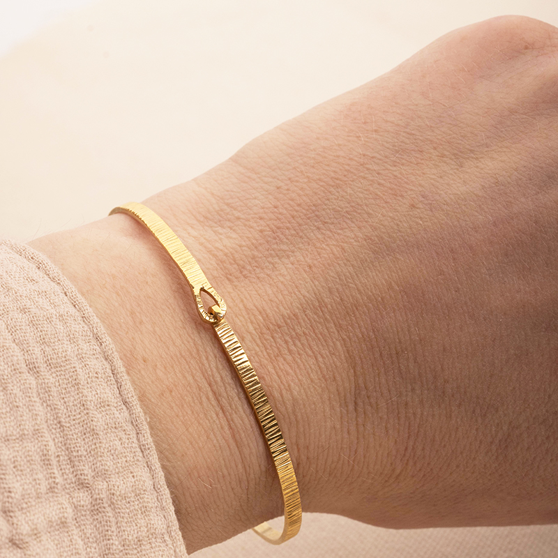 Elegancka bransoletka BANGLE typu obręcz, recznie wykonana ze srebra próby 925 złoconego na 2 mikrony. Bransoletka zapinana fakturowana w delikatne paski, które subtelnie odbijają światło i dodają całości nowoczesnego, ale szlachetnego charakteru.